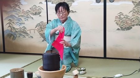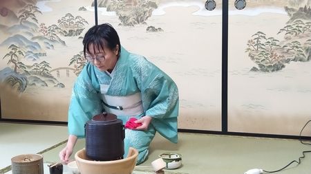 Další zastávka byla v japonské čajovně. Byla nám předvedena příprava čaje, obřad pití a sami za pomoci asistentky v kimonu jsme si připravili vlastní čaj. Sedělo se při tom na rohožích a skoro po 1,5 hod kolena dost bolela.