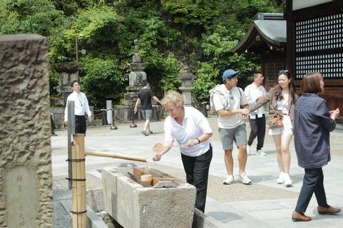 Druhýn chrámovým komplexem, který jsme navštívili, byl Otowasan Kijomizudera (Chrám čisté vody). Je to jedna z nejznámějších památek v Kjótu. Historie chrámu sahá až do roku 798, ale současné budovy byly postaveny v roce 1633. Jméno chrámu je odvozeno od vodopádu, který se nachází uvnitř komplexu - kijoi mizu, což doslova znamená čistá voda. Od roku 1994 je chrám zapsán na Seznamu světového dědictví UNESCO.