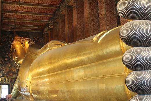 Další Buddha byl v chrámu Wat Pho. Tentokrát odpočíval. Při jeho kolosální délce čtyřiceti metrů se mu nedivím, že leží.