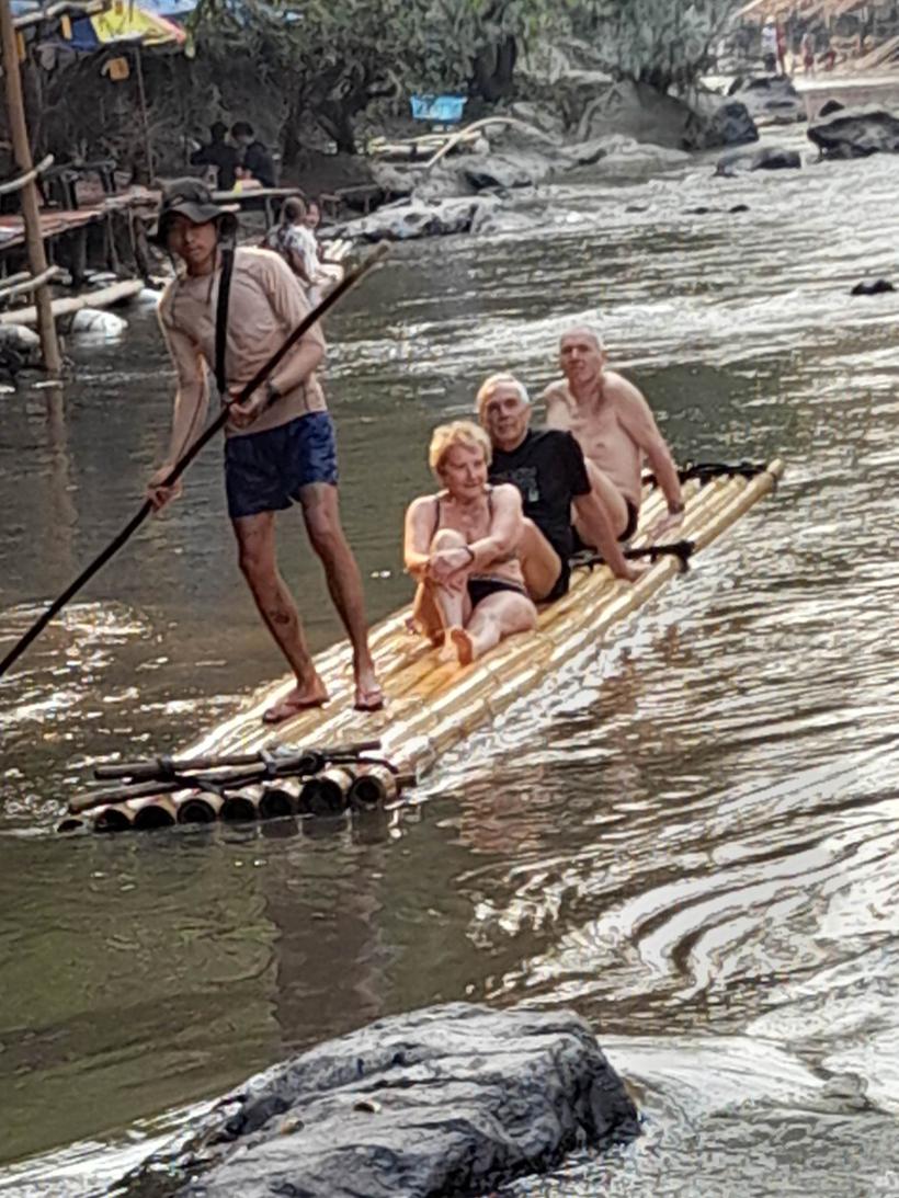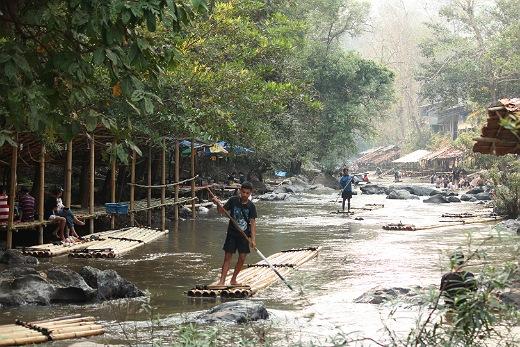 Po obědě ve vesnici kmene Shan jsme sjeli k řece Mae Win kde na nás čekaly bambusové vory. Je to osm bambusových tyčí dlouhých asi 10 m, na kterých si sednete. Kolem vás stříká voda a maník s tyčí zajišťuje směr plavby.