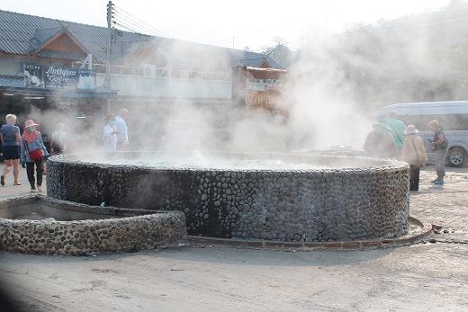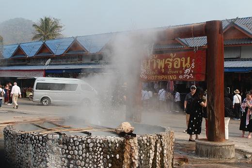 V osm hodin jsme vyjeli z Chiang Mai na sever - směr Zlatý trojúhelník. První zastávka byla v místním Národním parku se sirnými prameny. Voda byla přes 80 C a místní nabízeli ve vodě vařená křepelcí vajíčka. Nebo bylo možné si ve vodě "osvěžit si nohy". Zkusil jsem si to a bylo to docela příjemné.
