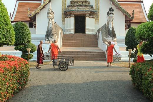 V městě Nan jsme jsme navštívili klášter Wat Phumin, 500 let starou stavbu křížového půdorysu v laoském stylu. Ve městě byla den před naší návštěvou slavnost, tak museli mnichové uklízet.