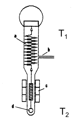 Pro poznání vlivu vlhké atmosféry na tuhé dielektrikum je nutné umět zjišťovat adsorpční vlastnosti jednotlivých materiálů. K experimentálnímu studiu adsorpce se používají sorpční váhy Mc Bainový váhy (obr. 1). Ve svislé trubici, z nichž se vyčerpá vzduch, je umístěna spirálová váha. Adsorbent je zavěšen na konec spirály. V dolní části trubice je v kapalném stavu malé množství sorbátu. Mění-li se v dolní části trubice teplota T2, dochází ke změně tlaku par sorbátu. Ten se sorbuje zavěšeným adsorbentem. Hmotnostní přírůstek adsorbentu se projeví prodloužením spirály. K sorpci dochází při teplotě T1, která je pomocí termostatu udržována v horní části vah. Množství takto sorbovaného plynu prodaný tlak a teplotu můžeme obecně vyjádřit vztahem: