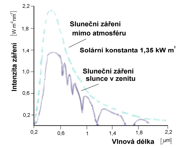 Intenzita slunečního záření se průchodem paprsků atmosférou zmenšuje. Dochází jednak k rozptylu paprsků odrazem o molekuly plynů a částečky prachu ve vzduchu, jednak k absorpci záření víceatomovými plyny (vodní párou H2O, oxidem uhličitým CO2 a ozónem O3) obsaženými ve vzduchu. Ozon vyskytující se ve výškách 20 až 50 km nad zemským povrchem pohlcuje ultrafialovou složku slunečního záření. Proto se paprsky s vlnovou délkou 0,29 µm prakticky na zemský povrch nedostanou. Oxid uhličitý pohlcuje paprsky s vlnovými délkami 2 až 2,8 µm; 4,2 až 4,4 µm a 13 až 17 µm. Obsah vodní páry v atmosféře je velmi proměnlivý a proto jsou i velké výkyvy v pohlcování slunečních paprsků vodní parou. Nejvíce jsou pohlcovány paprsky s vlnovými délkami 0,72; 0,93; 1,1; 1,4; 1,8; 2,3 až 2,5; 4,4 až 8,5 a 12 až 60 µm (~~obr.#~~).