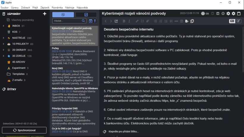 Hlavní funkcí, co jsem od poznámek chtěl, je synchronizace mezi počítačem a telefonem. Joplin umí poznámky ukládat:
